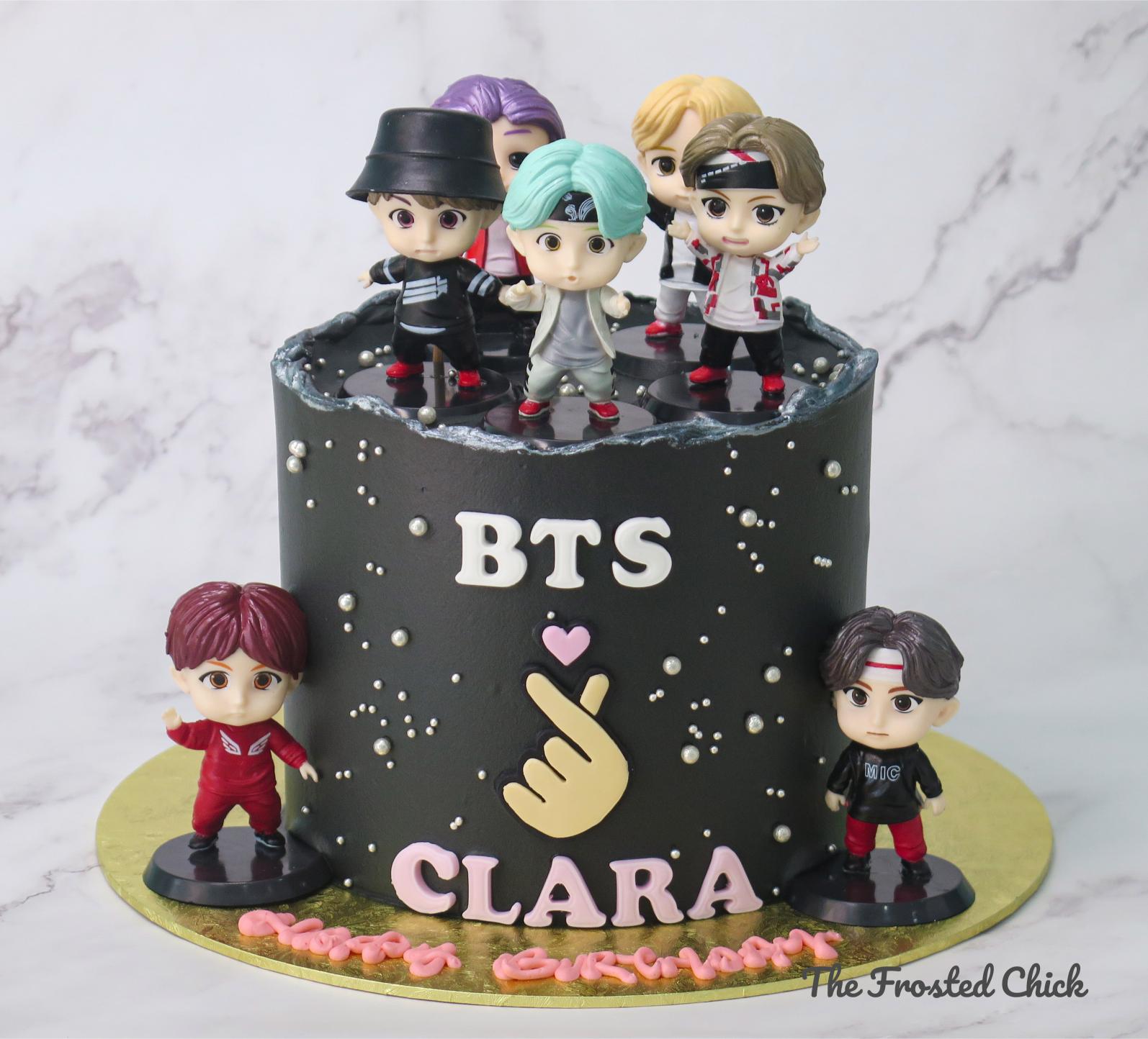Kpop idols BTS are one of the biggest performing acts right now. Know a BTS fan, affectionately known as ARMY, turning 21? Celebrate with a BTS Mic Drop Cake, featuring black buttercream with silver accents, BTS fondant wordings, and fondant finger heart. Complete with BTS members toy cake toppers, our BTS Mic Drop Cake is definitely the perfect 21st birthday gift idea for a dedicated ARMY.
