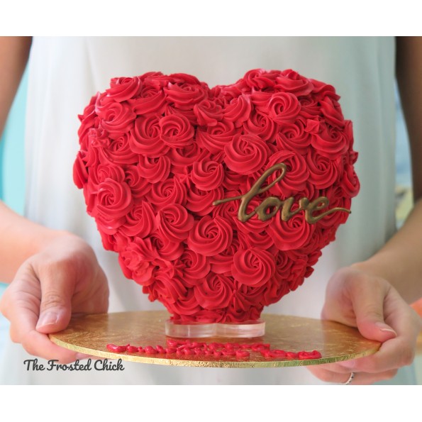 Win your date over with this gravity defying Sweetheart Rosette Cake! The heart shaped cake features buttercream frosting in rose design and a chocolate “Love” piece balanced on an acrylic heart stand. This rose heart cake looks amazing in photos and even better in real life!